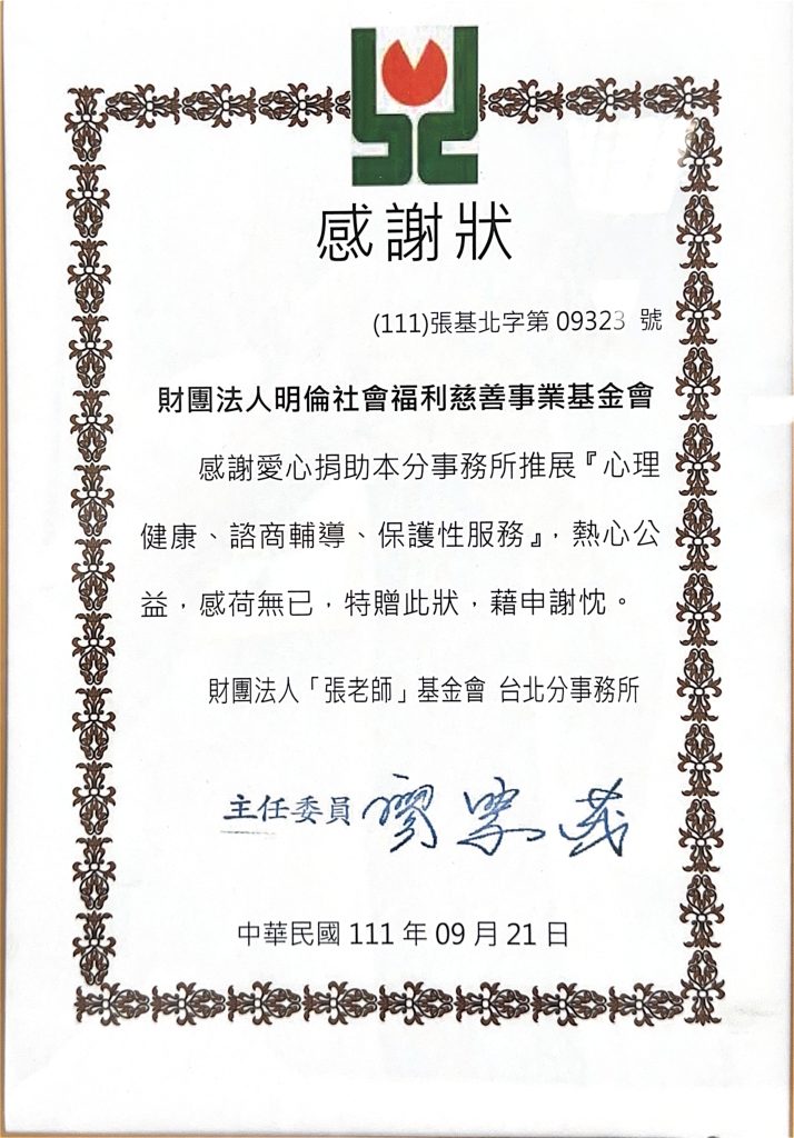 2021年愛心捐助推展心理健康,張老師基金會頒發感謝狀